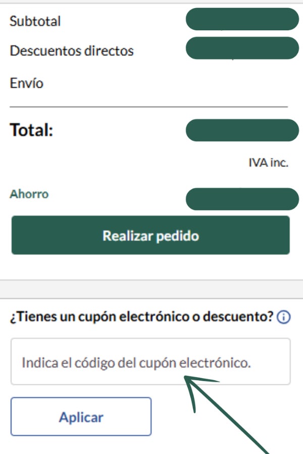 - Agrega tu cupón en la derecha donde dice "¿Tienes un cupón electrónico o descuento?.