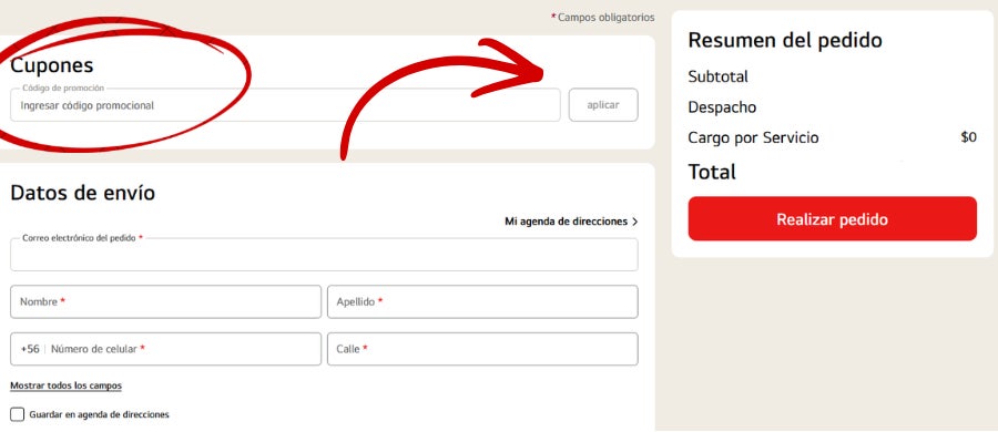 - Al momento de pagar, ingresa tu cupón en parte superior izquierda.