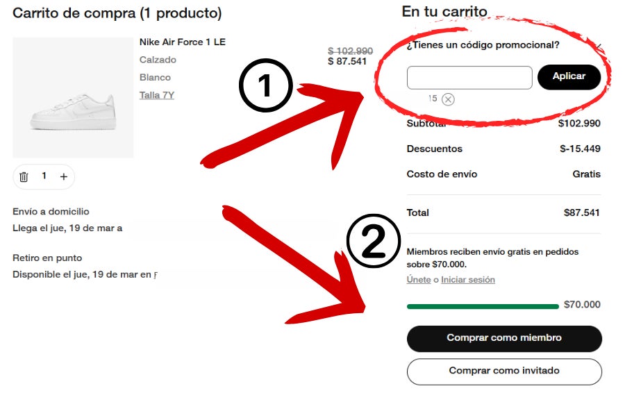 Antes de pagar se te indicará donde pegar el código del cupón para obtener tu descuento Nike de manera inmediata.