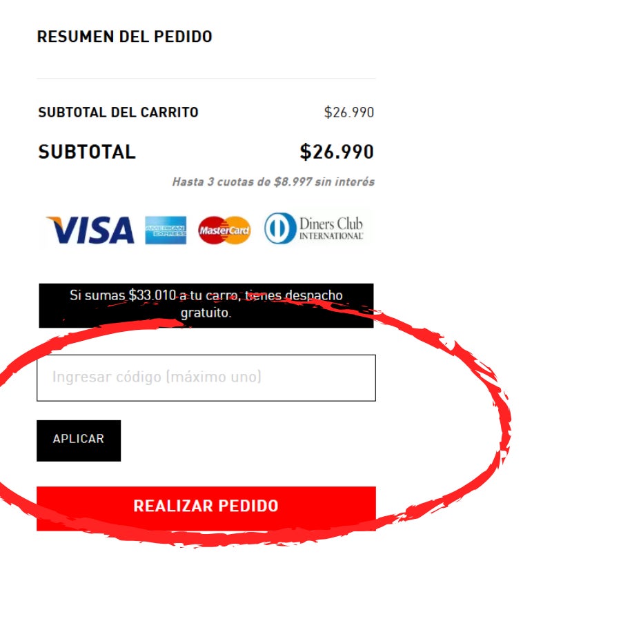 - En el detalle del carrito, en la parte derecha encontrarás un recuadro que dice "Ingresar código (máximo uno)".